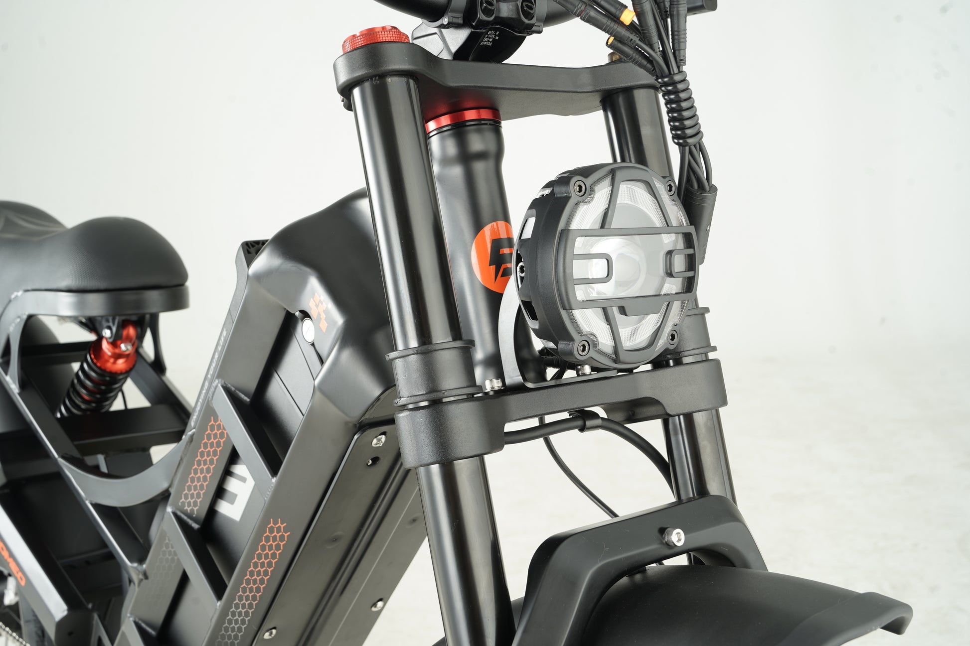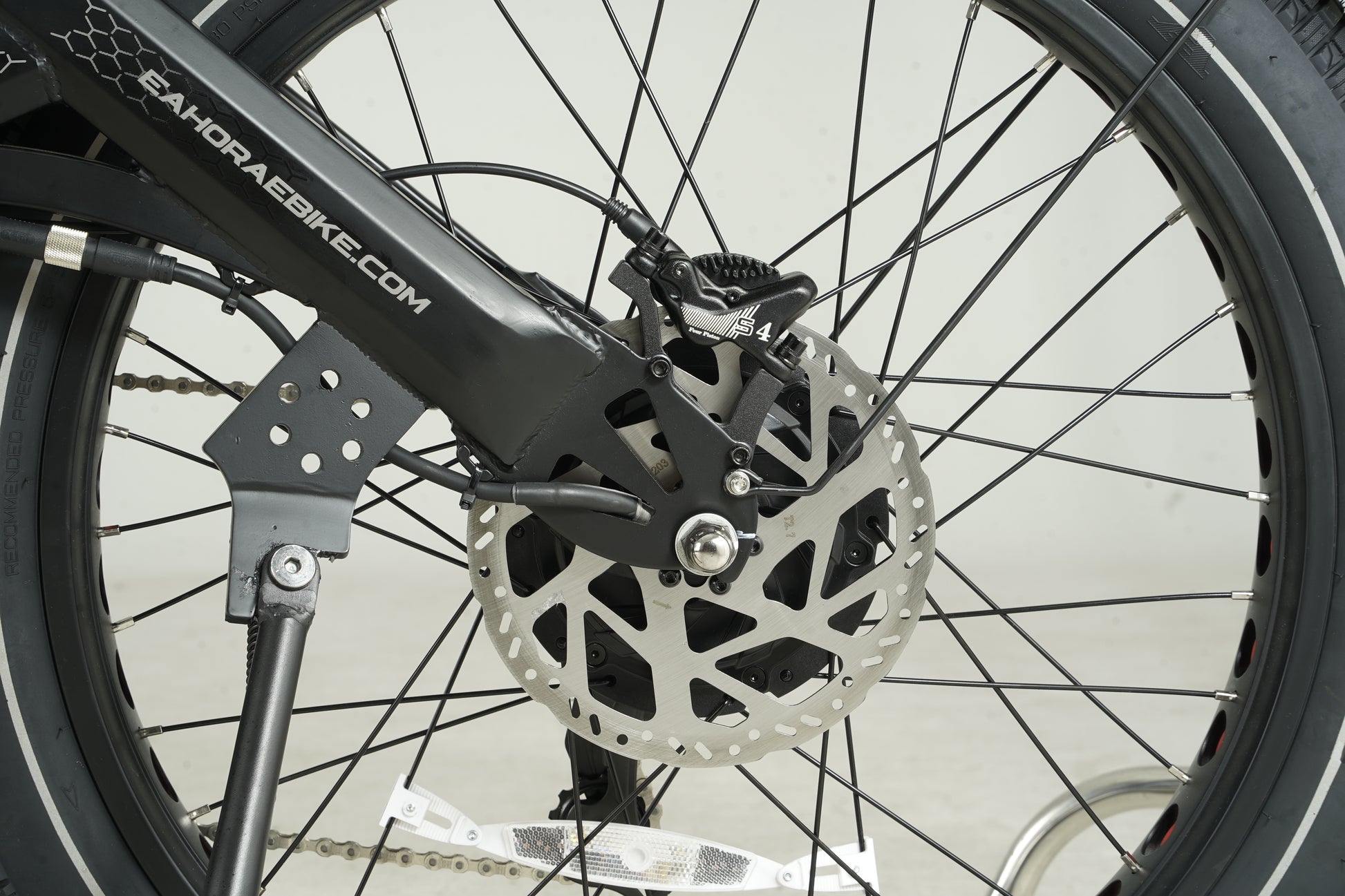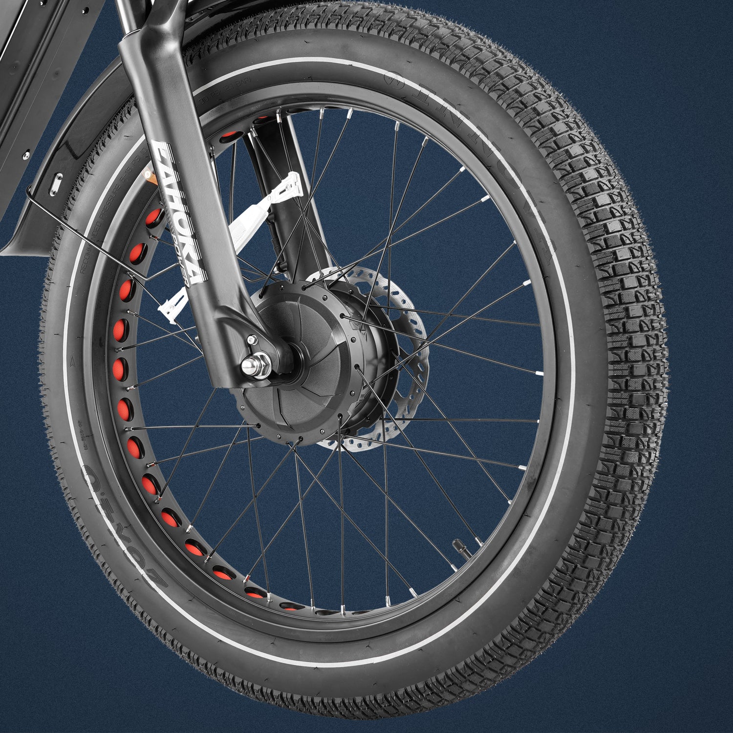 The 26″ × 4.0″ tires hug the ground with more contact surface increasing grip and stability - Comfort on potholes and dirt roads, grip on wet surfaces and sand go wherever you want with more confidence