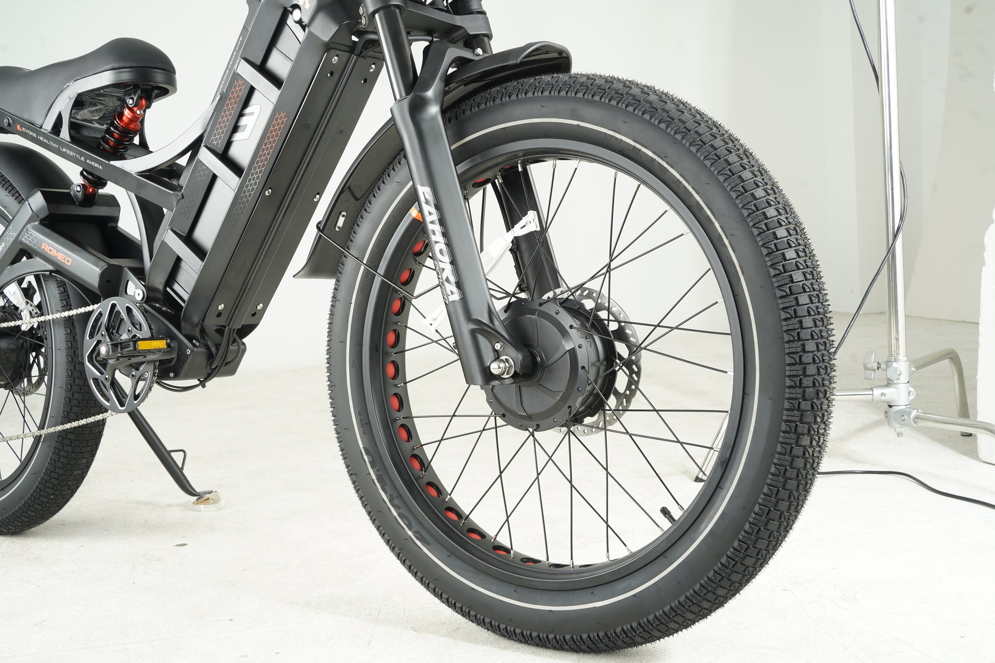 The Romeo Pro 2 is a high-performance fat-tire e-bike built for riders who demand power, range, and comfort on any terrain. Dual 1500W hub motors deliver instant thrust, while the 52V 60Ah (3120 Wh) battery unlocks truly long distances. A full-suspension setup (100 mm adjustable hydraulic fork + air shock with damping) smooths out potholes and trails alike; hydraulic disc brakes with motor cut-off provide confident stopping. The 26"×5" fat tires add grip, stability, and plush ride feel. Designed for both city streets and off-road, Romeo Pro 2 blends speed, real-world range, and all-day comfort in a rugged, reliable package.
